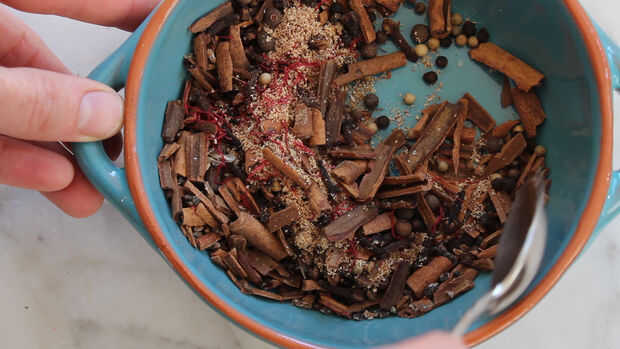 Agregar el clavo de olor, pimienta y azafrán en el Bol. Mezclar.