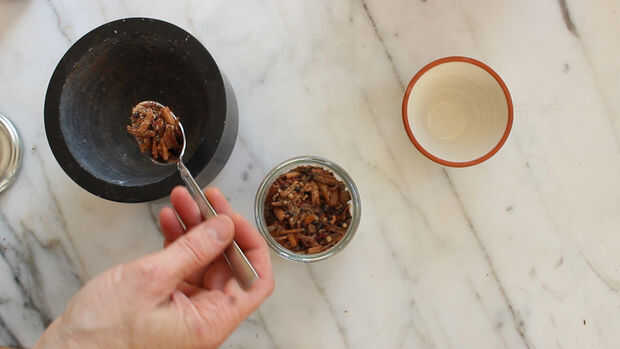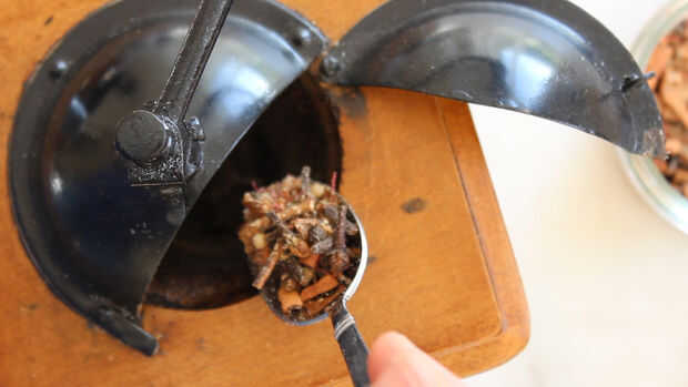 Tomar una cucharada grande de su Masala Chai y o aplastar abajo finamente en el mortero o moler para arriba en un molinillo de café.