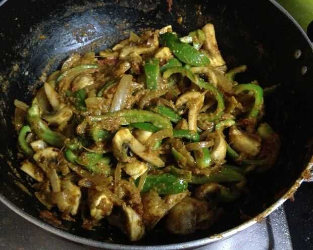 1. Revuelva en la picada, pimientos y champiñones. En esta etapa la salsa masala luz está lista para mezclar en los ingredientes principales es decir, el pimiento y champiñones. Agregarlos y revuélvalos bien. Cubrir la cacerola y cocinar durante 5 minutos en medio a la luz de la llama.