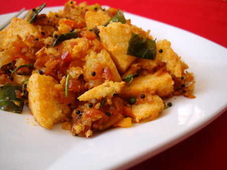 Idli - picado de corte de 5 a 6 trozos aceite cebolla - 2 tomates - 3 jengibre picado y ajo en pasta - 1/2 cucharadita verde chiles - 1 corte unos Curry deja unas hojas de cilantro sal al gusto polvo de Sambar - 1 a 2 cucharaditas de polvo de cilantro - 1 cucharadita de canela, clavo de olor agua
