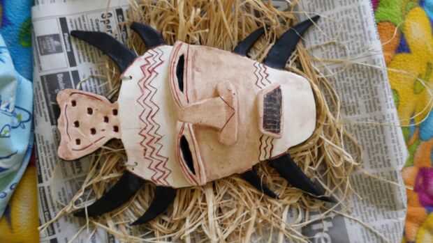 La hice por el despliegue de alguna arcilla y cortando las formas. Luego se deslizó y les anotó así que quedaría. Coloqué papel enrollada debajo de mi máscara para hacer más cóncavo, luego alisó hacia fuera los ojos, nariz, boca y el resto de ella. Luego tallada en los detalles y esperando que se seque. Una vez que seca usé papel de lija para hacerlo liso donde algunas asperezas, y mi maestro disparó. Finalmente su sede por pintura y materiales orgánicos como el café y paja como material. No fue despedido después de él, pinté mi pieza era completa.