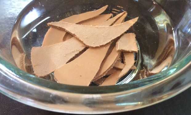 Sumergir todas las piezas de cuero en agua tibia para ablandar. Usted verá las burbujas procedentes de la piel (son pequeñas pero visibles en la parte superior de la foto.) una vez que las piezas deja de burbujear, generalmente 2-3 minutos, quitar cada pieza, pulir los bordes y forma cada uno individualmente.