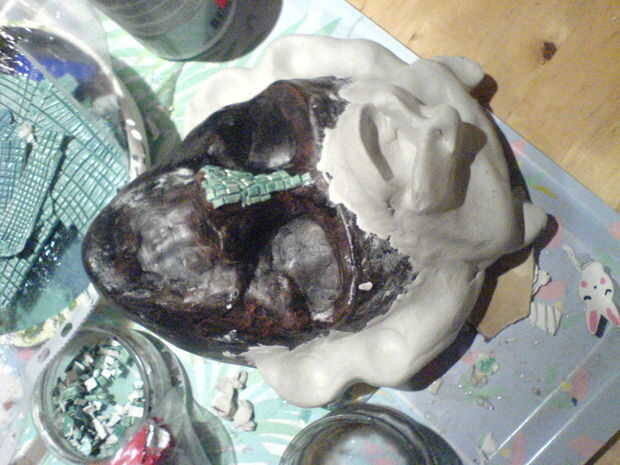 Como se puede ver en las fotos ya empecé pintando y pegando en las baldosas cuando me decidí a esculpir en un jaguar. No recomendaría hacerlo de esta forma redonda ya que tuve que pintar la máscara.