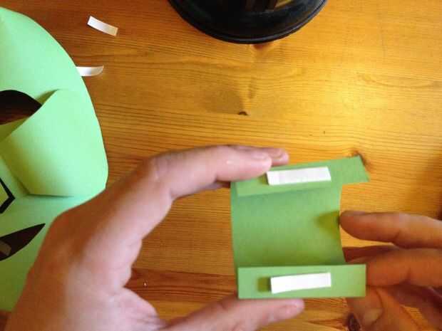 Ahora agregado doble la cinta echada a un lado a las fichas y adjuntarlos a la mascarilla, alineando la parte superior más justo debajo de la boca y la inferior en la parte más baja de la barbilla.