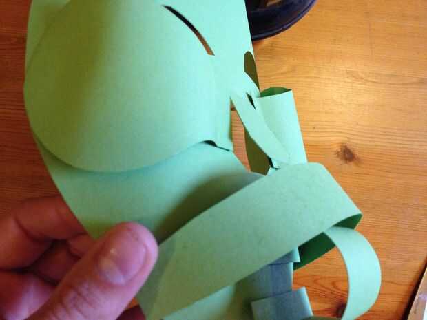 Tomando una de las tiras largas curvas, asegurándose de que curvee hacia abajo (como una "n") agregado de un extremo a la mascarilla y luego la curva de la franja de Ronda y coloque al otro lado. Que tenga un poco de más caída, sólo cortado.