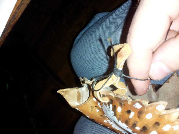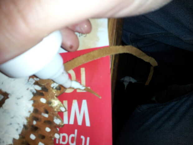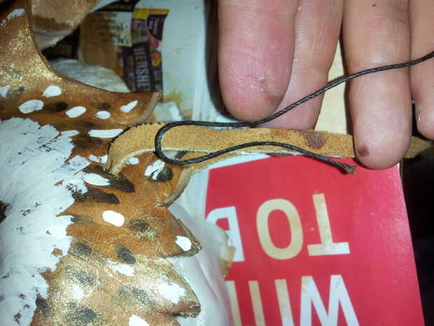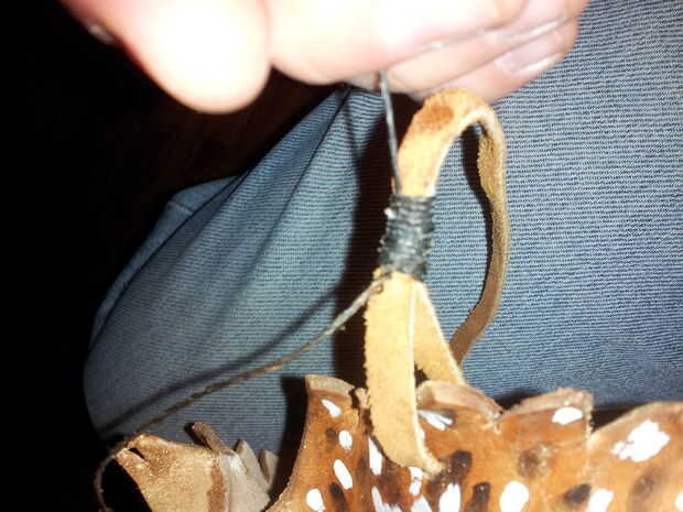Recorren los 2 pedazos de cordón de cuero de 15" cada uno de estos agujeros. En cada una de estas piezas de encaje, añadir un poco de pegamento para sostener el extremo del cordón a la donde lazos alrededor.