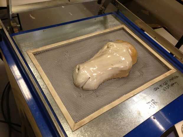 Las piezas del dos espejo fueron trabajados a máquina por separado en MDF lijadas y revestidas con yeso. Las esquinas de los ojos y fosas nasales fueron perforados a través para evitar bolsas de aire durante la extracción de vacío. Las piezas eran vacío formado de plástico PETG por su claridad y fuerza, como quería el de ojos claro y guardado y dinero por lo que una característica moldeada de la superestructura. PETG cuesta más de ABS o estireno, pero la diferencia de costo es compensada por el extra coste de añadir ojos claros después del hecho. PETG recoge su extremadamente fino detalle, así que asegúrese de que su trabajo con una superficie perfectamente lisa. Imperfecciones leves pueden ser alisado-hacia fuera con una pistola de la cabeza o un mechero.