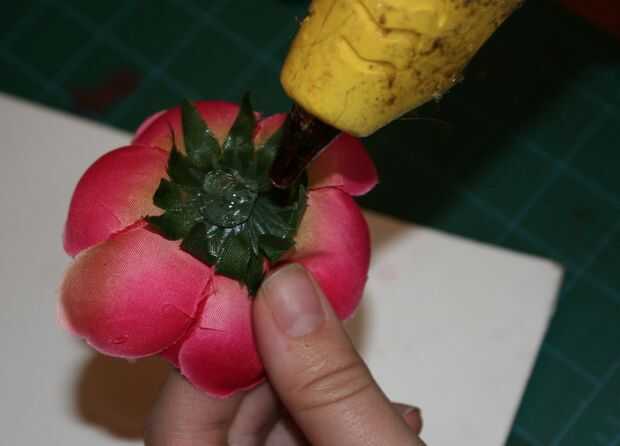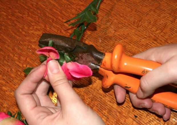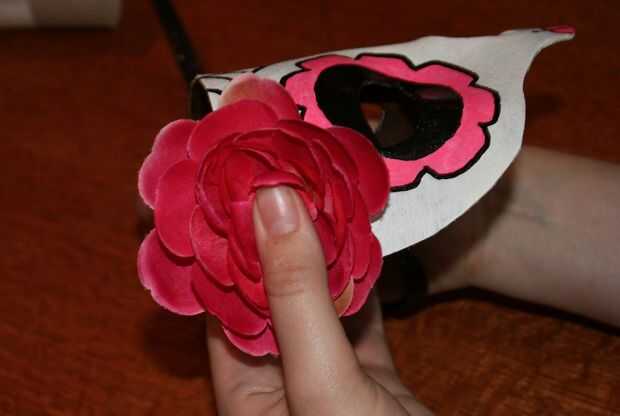 Para la flor, utilice cortadores de alambre para quitar la flor en la base del tallo. Decidí utilizar pegamento caliente para asegurar a la máscara. Debatí coser en, pero de esta manera la parte posterior de la máscara se mantiene al ras. También, el pegamento caliente derrite el plástico en la parte posterior de la rosa para fijarlo mejor.