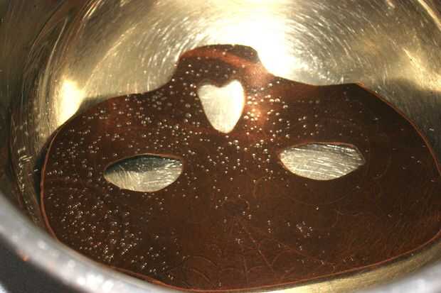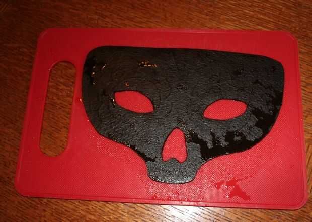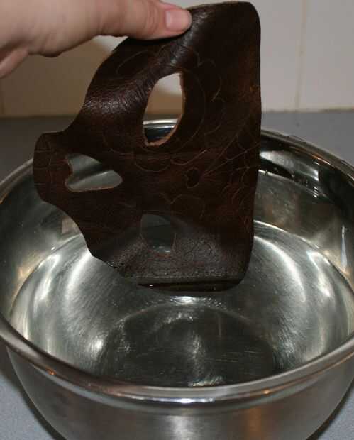 Coloqué mi máscara en agua tibia. Cuando usted primero pone el cuero en el agua verás un montón de burbujas. Cuando las burbujas se detienen, tomar la máscara fuera del agua.