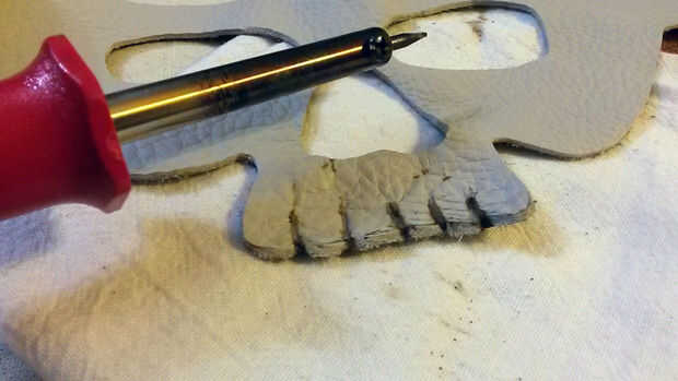 Me encanta grabar cuero. La forma de rizos y quema siempre es interesante, así que decidí utilizar un quemador de soldadura de hierro y madera para dibujar en los dientes. Esto es opcional y podría hacerse fácilmente con la pintura más adelante en el proceso.
