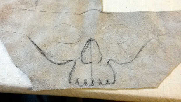 Dibuje su calavera en la parte posterior de su cuero. Si usted está preocupado acerca de la simetría, dibujar un lado primero en papel luego recórtalo y rastro en tu piel uno a uno.