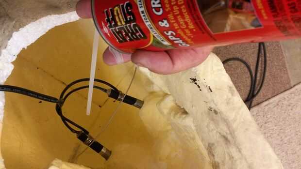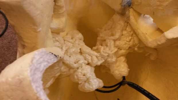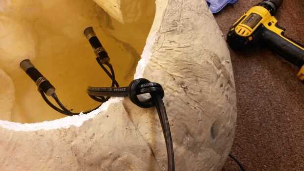 No olvide hacer un nudo en el cable de alimentación, por lo que no puede ser tirado flojo por el casco. Medir un trozo de alambre rígido, hacerla una pulgada de largo y doblar los bucles en los extremos para no meter a través de la espuma de poliestireno. La cuña en el cráneo para apoyar los lasers, espuma de uretano sobre todo el conjunto, todo bloqueo en su lugar.