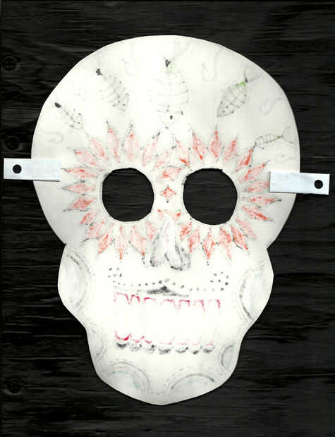 1. cortar una tira fina de papel y sobre cerca de cuatro veces hasta que quede aproximadamente una pulgada de largo. Hacer un agujero en un extremo de la misma. Unir las capas y luego pegar la tira sobre el borde de la máscara a los lados de los zócalos del ojo con el agujero que se pega hacia fuera.