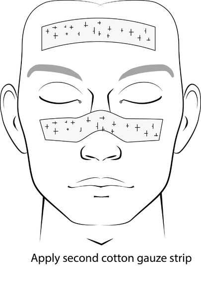 ... Rápidamente tomé una segunda tira, lo cruce exprimido hacia fuera el yeso extra y drapeado sobre el puente de mi nariz. Lo hice otra vez, que cubren mis sienes, mejillas superiores y la zona entre mis cejas. No estaba buscando nada elegante o bonito ahora, sólo estaba tratando de crear un molde de mi cara. Una vez mi todo "espacio blanco" se ha cubierto con las tiras de gasa, relajado y escuchando algo de música. El yeso necesario unos 20-30 minutos para endurecerse lo suficiente para quitar de mi cara.