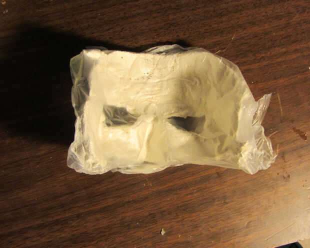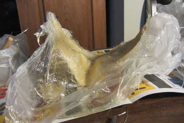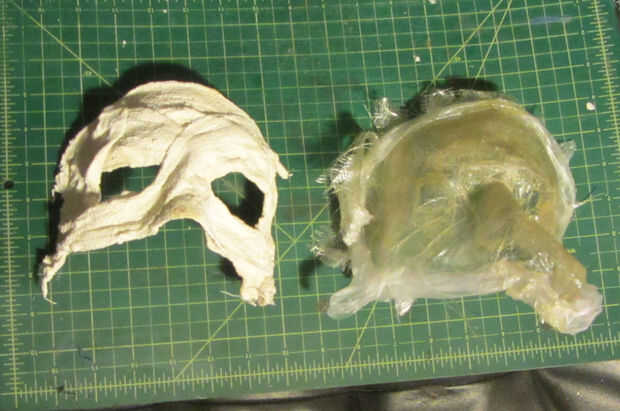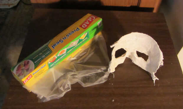 Aquí hay un Consejo importante: una vez que establecer la capa final de tiras de tela de fibra de vidrio, quitar ambos guantes y cortar una sección del abrigo de Saran sobre un pie de largo. Coloque esta hoja sobre el lado pegajoso de la máscara y presione con muy cuidadosamente con los dedos ungloved contra las capas de tejido resinado de fibra de vidrio. Con los guantes del abrigo de saran no se adhieren a usted y usted puede presiónelo contra todas las capas de tela de fibra de vidrio, les colaboran y garantizar un vínculo apretado. Cuando haya terminado, deje el abrigo de saran en su lugar. También usé ropa pasadores y clips de mariposa alrededor de los bordes presionado y curado. Después de la resina ha curado, puede pelar el abrigo de saran apagado más adelante.