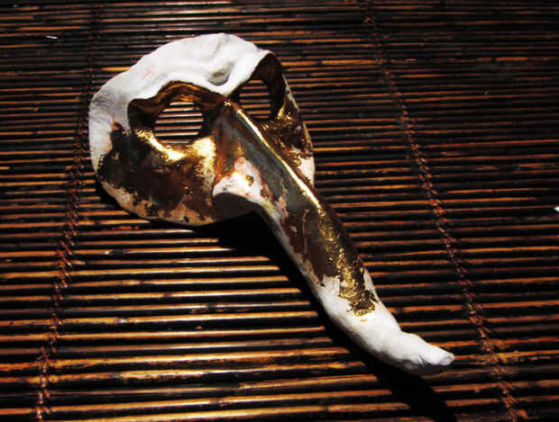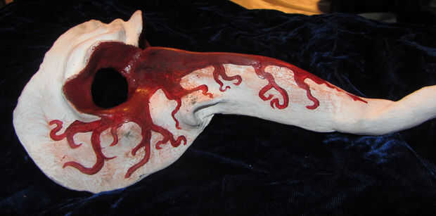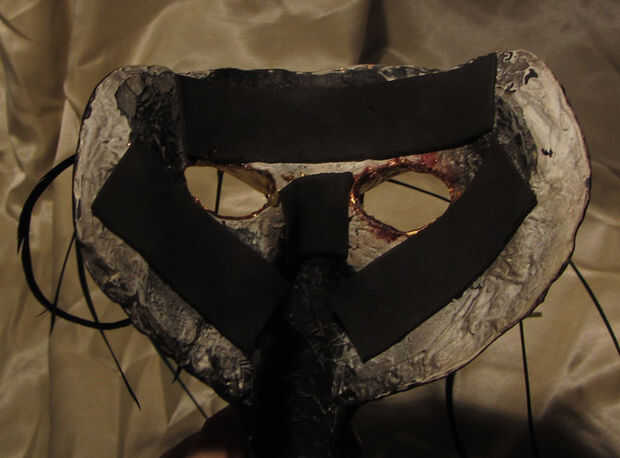 Yo también quería hacer mi máscara cómodo para usar contra mi cara, así que añadido algunos delgadas amplias tiras de neopreno acolchado en el interior de la máscara. Eran ya pegamento en un lado para aplicarles fue fácil. La máscara puede ahora sentarse en mi cara sin dejar ninguna marca o cavando en mi piel en cualquier parte. Perforar un agujero a cada lado de la máscara cerca de las orejas y me recorrió un cordón de cuero negro (tipo cordón) cada uno que permite que la máscara para ser atado detrás de la cabeza. La máscara final resultó más pesada de lo que esperaba, así que finalmente un segundo conjunto de agujeros y un segundo conjunto de cuerdas eran también necesarios. Estos cables se cruzan como ir alrededor de los lados y la parte posterior de mi cabeza para que la máscara se sostiene bien por ellos y no deslice hacia adelante o incline mi cara mientras la lleva puesta.