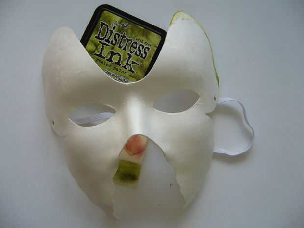 Inicio de entintar o pintar los bordes de la mascarilla. No tinta de la máscara en sí a menos que sepa exactamente donde se van las imágenes. Después de hacer la izquierda pensé que estaba hecho así que rubricó el lado derecho con color rojo brillante. Entonces me di cuenta que quería otra imagen para ser el punto focal. Desafortunadamente cuando le pegué al, el rojo brillante brillaba a través de. Es por ello que el hada de la derecha es tan rojo alrededor de su cara. Así que aprender de mis errores :)