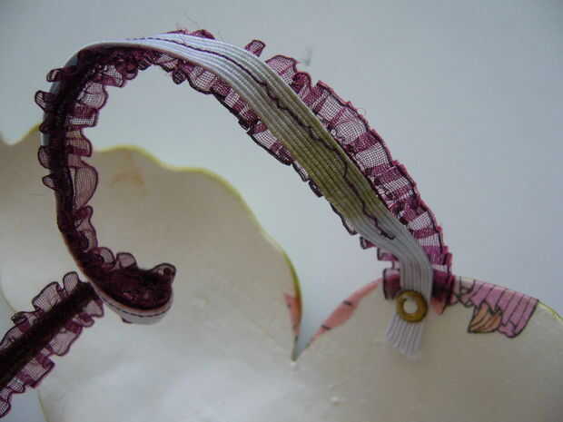Los ajustes que utilicé fueron elástico que era perfecto para el soporte de goma y el cuello. No tiene que ser perfecto, sólo tiene que pegar. Si no tienes ningún elástico adornos podría cortar lejos la goma y coloque cinta largo sedosa que atar en la parte posterior de la cabeza. Cosí mina en con una costura para telas elásticas. Otra solución es tirar de la goma mientras cose. Esto hará que la cinta que se utilizar para crujir encima de cuando la goma se va a su forma original, lo que significa que no se romperá cuando se tira sobre su cabeza.