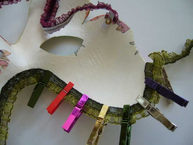 Una pieza de moldura decorativa alrededor de los bordes del pegamento. Encontré estos cierres mini una gran ayuda mientras el pegamento se seque. Sólo asegúrese de que no dejarlos durante la noche como que se pega a la máscara!