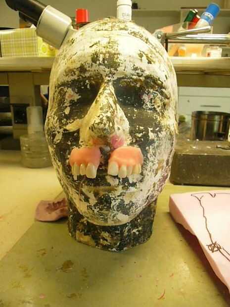 Estos son los dientes de acrílico regulares (preguntar al dentista o a un laboratorio dental para algunos (we´ve siempre tiene algunas de sobra ;)) O hacer su propio uso de Worbla Art Deco o lo que sea) que me casted en plástico líquido para formar la goma. Para asegurarse de que la máscara final cabrá en mi cara, he usado un modelo de mi cabeza, pero también se puede utilizar una cabeza de espuma de poliestireno en su lugar. Los dientes fueron pegados en el modelo con cola caliente. Si utiliza una cabeza de espuma de poliestireno, asegúrese de que el pegamento no está demasiado caliente o utilizar otras colas en lugar de otro.