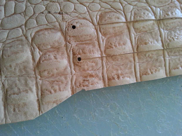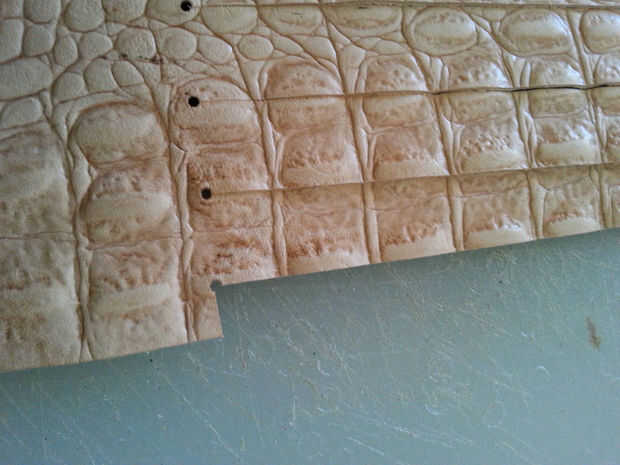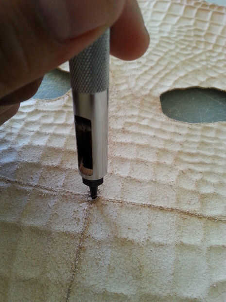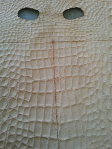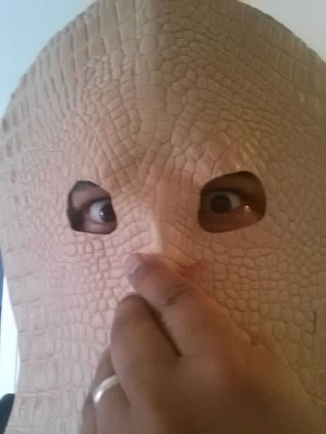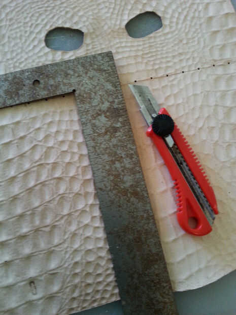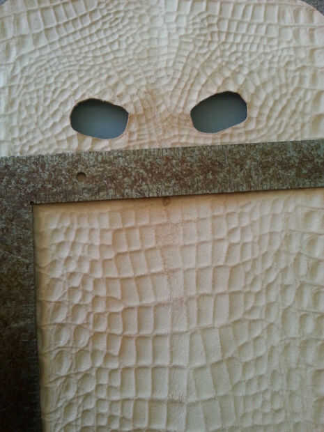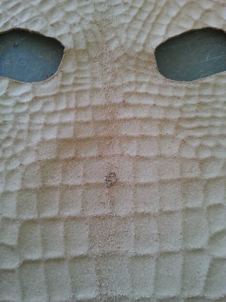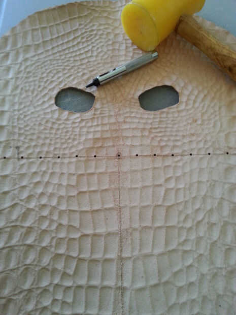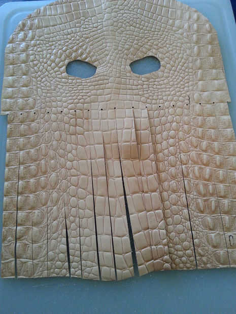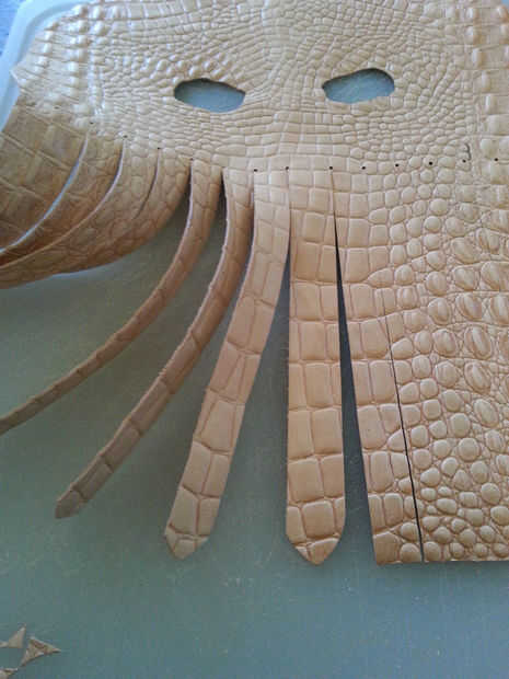 Utilizando tu regla y el más pequeño golpe en el juego, golpea por consiguiente espacio su agujero a lo largo de la línea horizontal, comenzando en el centro. Cuando se perforan todos los agujeros, use la regla clara y cortador rotatorio para hacer líneas paralelas desde abajo hacia arriba, parando justo antes de llegar a los agujeros. Utilizar el cuchillo para terminar el corte en los agujeros perforados, o el riesgo de cortar accidentalmente la mascarilla con la lámina rotatoria!limpiar los bordes de la máscara si es necesario y rematar los tentáculos con un golpe final de correa. Si no tienes una, usa un cuchillo. (Últimas dos fotos).