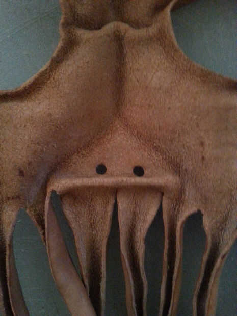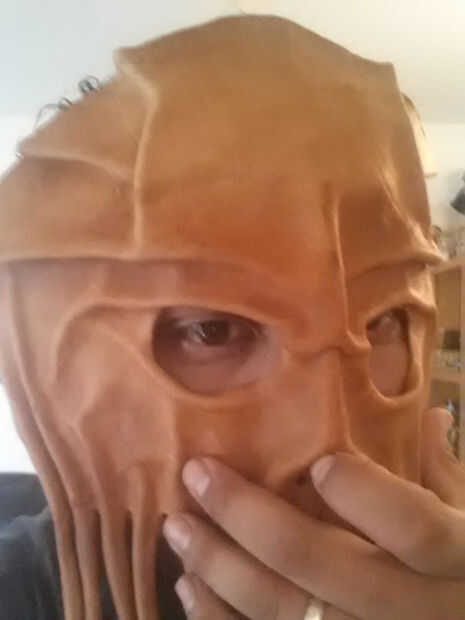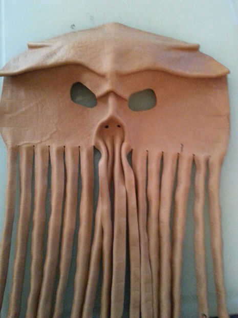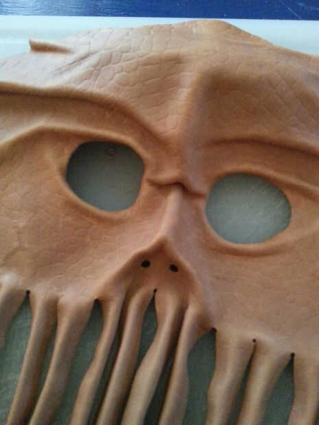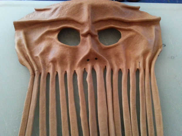 Esto es donde realmente empieza la diversión, y donde usted visión literalmente comienza a tomar forma! Mantenga la máscara en la cara y empezar a pellizcar y arrugando la máscara con los dedos. Sólo el amplio alimenta esta primera vez. Se centran en la nariz y los pliegues en la frente. Coloque la máscara en el horno durante 5 minutos.
