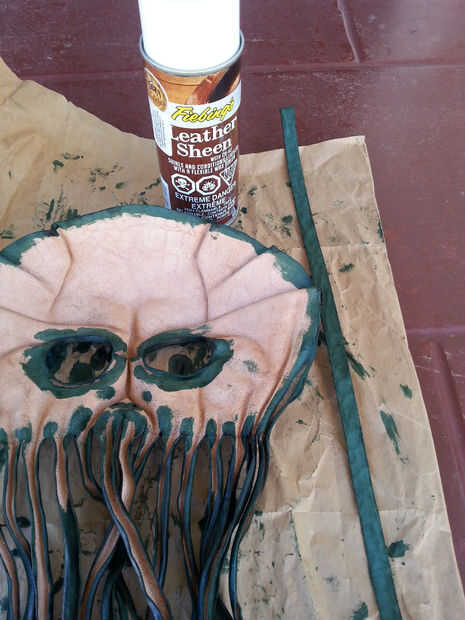 Vas a querer un revestimiento de cuero para proteger el tinte. Cuando se trata de máscaras, me encanta utilizar un spray de acabado... sólo hace vida más fácil. Va en forma pareja y se mete en todos los rincones y grietas de la máscara con el mínimo esfuerzo.