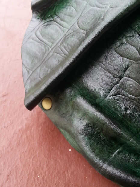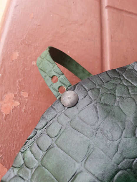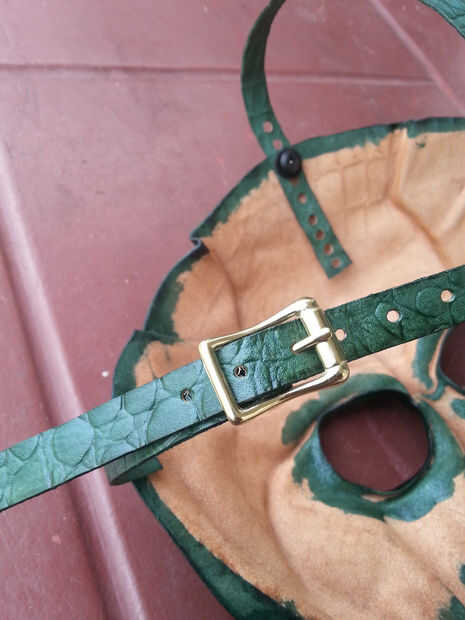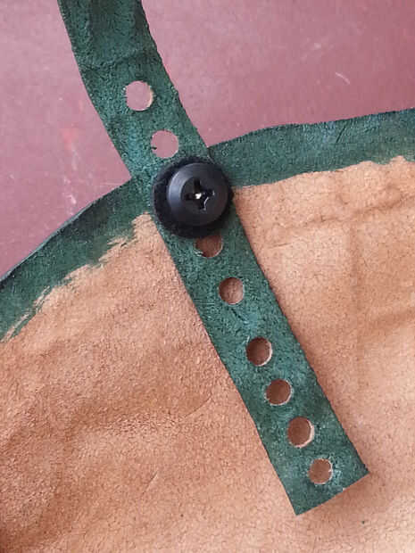 Por último, doblar el extremo de la otra correa en sí mismo, lo que es lo suficientemente grande para pasar la correa de la hebilla a través de él. (Ver foto 4 de arriba). Conjunto con un remache. Hacer varios agujeros en el otro extremo de la correa para crear una correa ajustable para garantizar en la cima de la cabeza. Asegúrelo con un tornillo de Chicago. (cuadros 5 y 6)