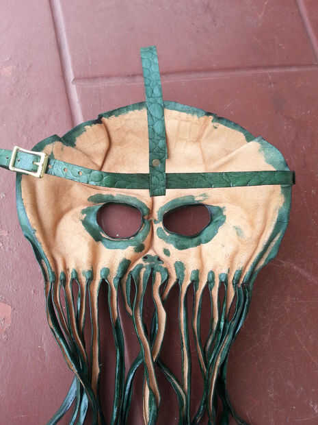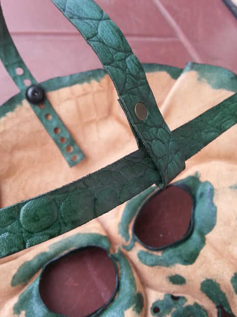 Ahora coloque las tiras a la máscara con sus extra pequeños remaches rápidos (ver tutorial más abajo). Conéctelos de tal manera que las correas descansarán por encima de sus orejas al usar la máscara.