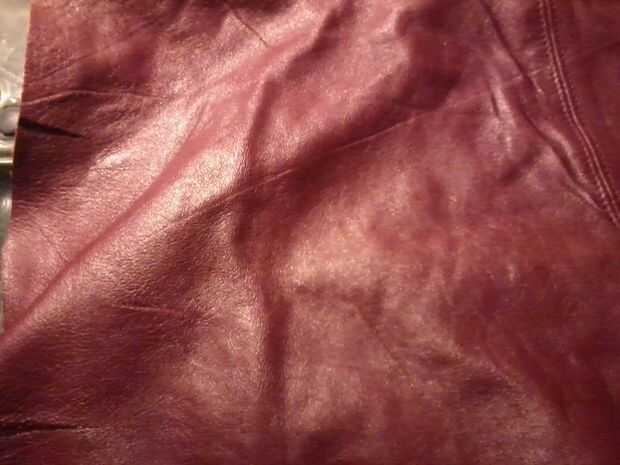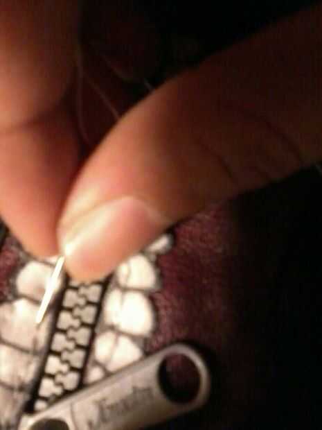 después de que ha cortado sus dientes diseñados, coser en el cuero rojo con cuerda blanca y coser los dientes cosidos y cuero en la cremallera.
