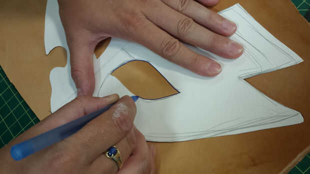 Muchos puristas de cuero prefiere un lápiz para esta parte, pero me gusta el bolígrafo. Con firmeza mantener su plantilla de papel sobre la pieza de cuero y trace una línea alrededor del borde exterior y los agujeros para los ojos con el lápiz. Easy peasy!