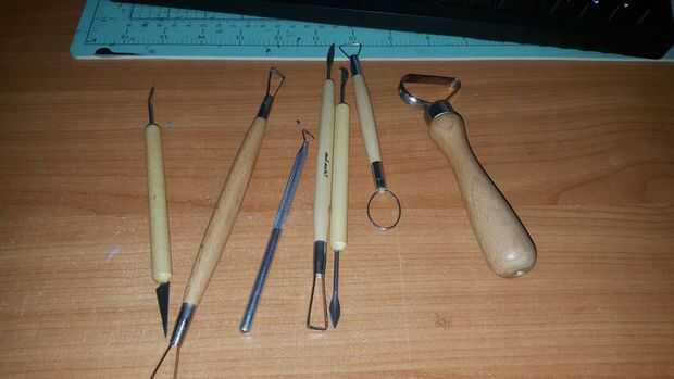5. pintar y esculpir herramientas. Usé pintura acrílica rojo carmesí, spraypaint de acero inoxidable y había probado algo con plata de la pintura en un segundo molde para los detalles. Las herramientas son muy útiles en la conformación de todo correctamente, en lugar de usar sólo los dedos.