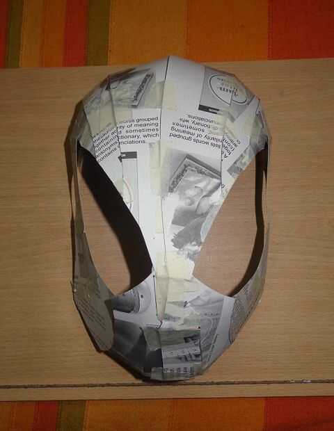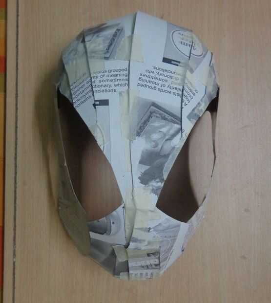 Sigue la 1ª foto de este paso y fije el diseño simplemente doblándolas. Sin pliegues, apenas llano de flexión. Este es el punto culminante del diseño de la máscara de Spider-man. No tiene ninguna variación de pliegues. Así que doble y fijar con cinta de enmascarar o cinta mágica. Después de colocar cada dos pedazos juntos, coloque sobre la cara y comprobar cómo está llegando. Cuando todos se unen le parece que las fotos al final.