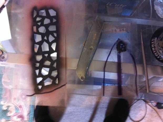 luego compone una plantilla y rocía las manchas grandes usando la pintura oxblood.