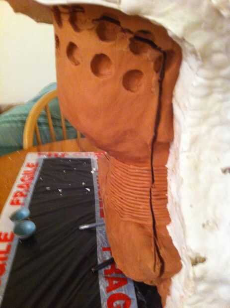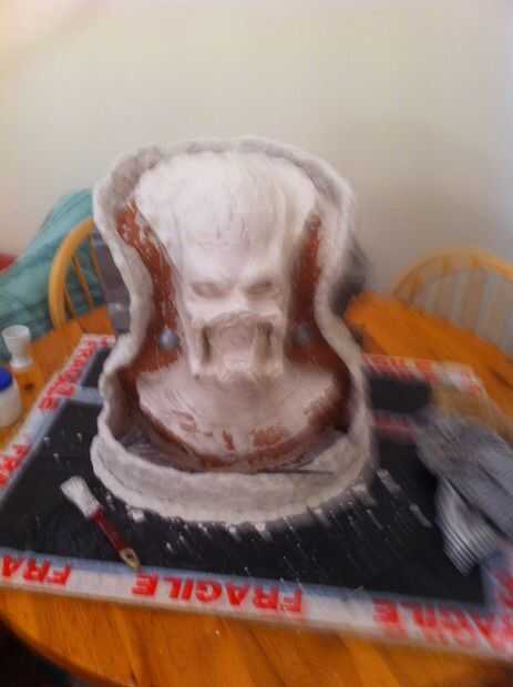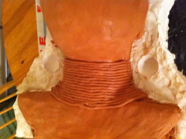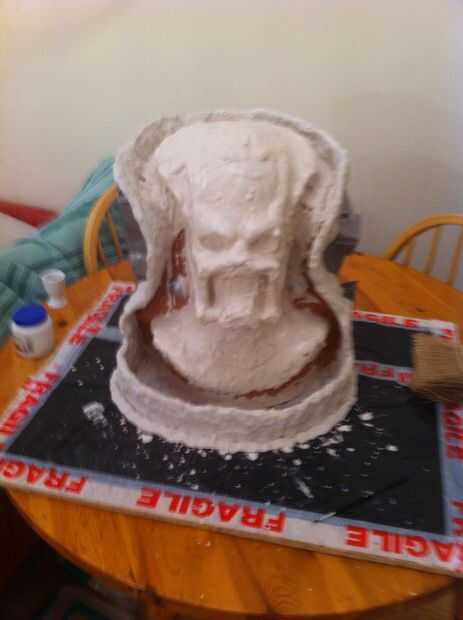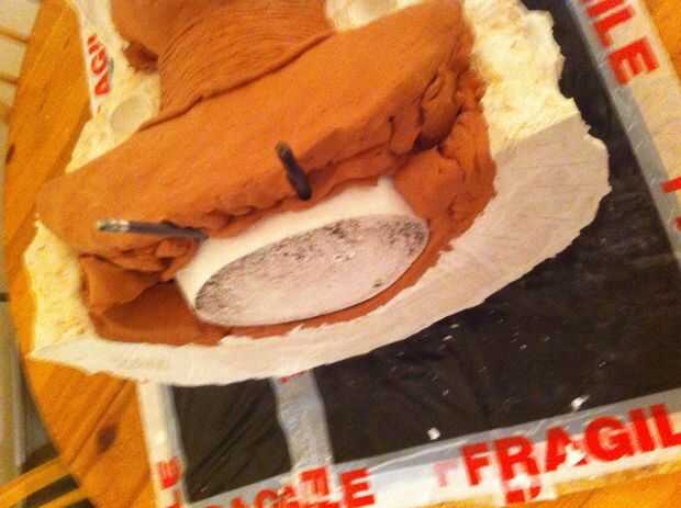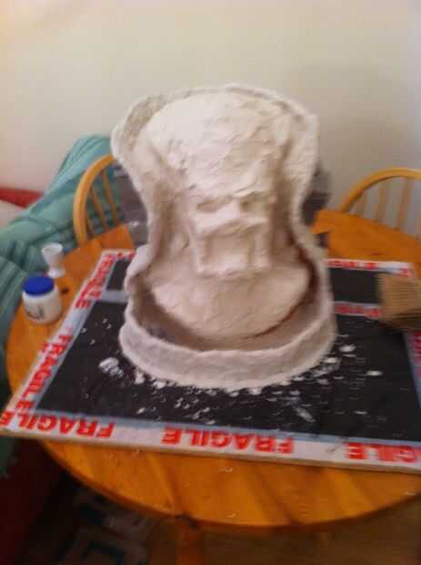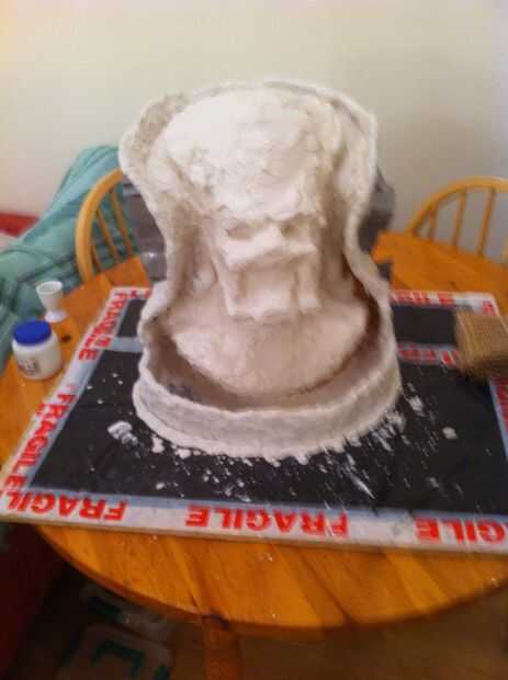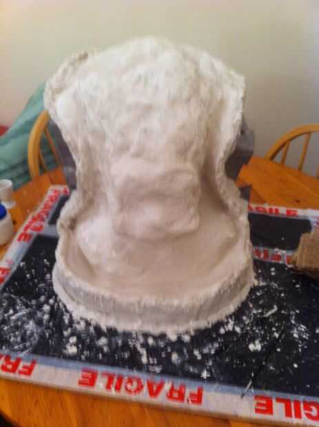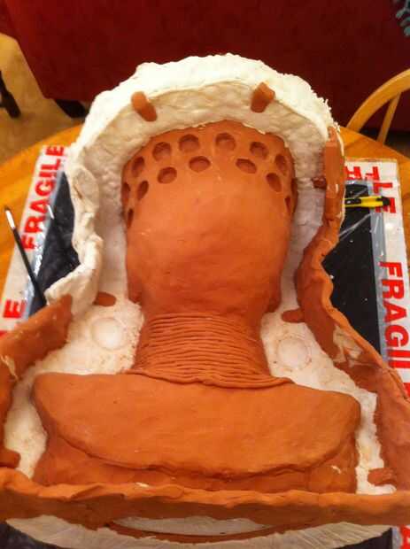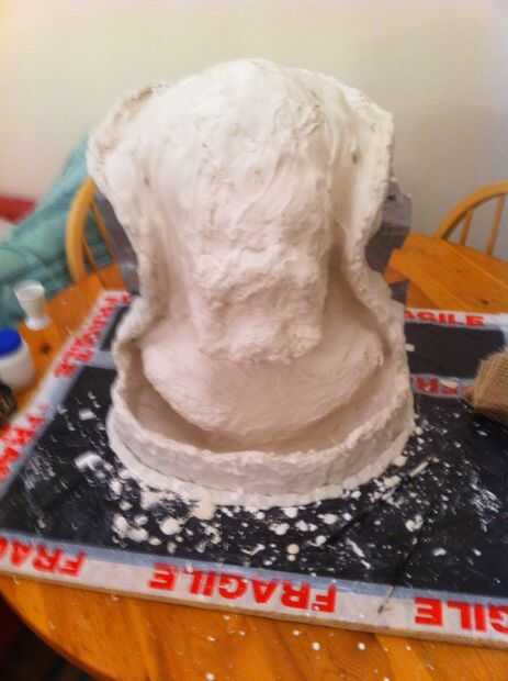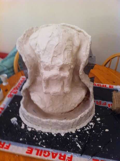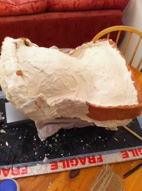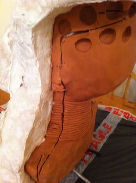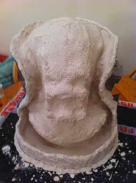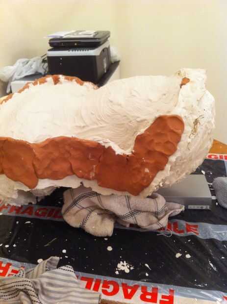 Ahora tenemos un grosor decente cubriendo la escultura que tenemos que empezar a construir en el refuerzo, empezar a poner pedazos de arpillera sobre la escultura y aplique el yeso en la parte superior. necesita para asegurar el espesor en áreas que son débiles se acumulan, en mi molde el ángulo en el molde en la línea del ojo sería débil por lo que esta había construido.
