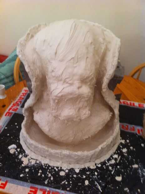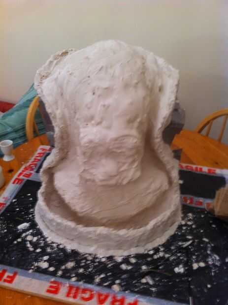 mezclar una mezcla acuosa de yeso, este debe ser la consistencia de crema líquida, luego vierta sobre la escultura, utilizando el pincel Asegúrese de que la mezcla líquida cubre la escultura tirando hacia arriba desde el pozo hecho en la parte inferior. Este paso es la capa de belleza, esto conseguirá los detalles de su escultura.