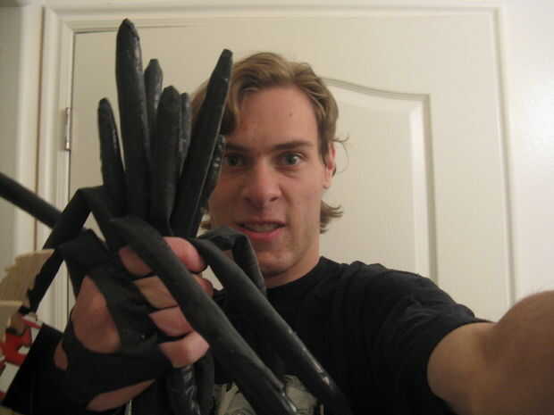 Con la ayuda de un poco enrollada de papel de aluminio, llenar la parte superior del temor a lo "curva" sin problemas. Puesto que no es una pieza sólida de disquete necesita ayuda para mantener una forma redonda. Utilizar pegamento caliente para fijar la base del temor a la cresta de la máscara. Tapa all up with más látex negro a mezclarse.