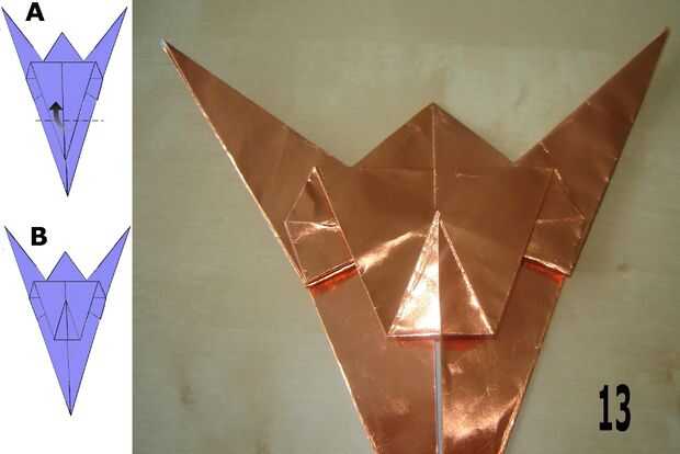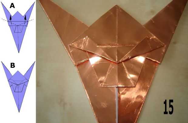 14 doble la solapa superior hacia abajo por el pliegue de centro sobre la nariz para formar la frente.