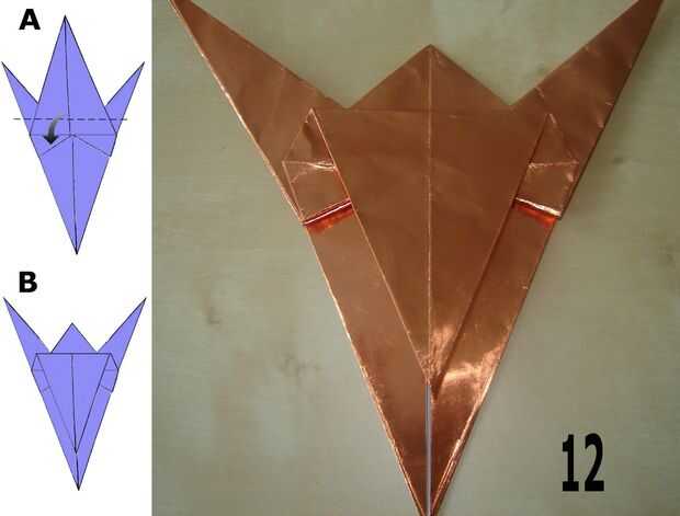 13 plegar la tapa frontal parcialmente hasta el pliegue de centro para formar la nariz.