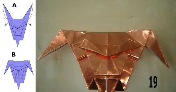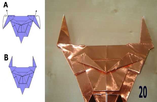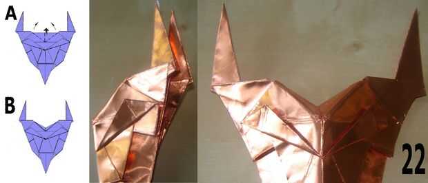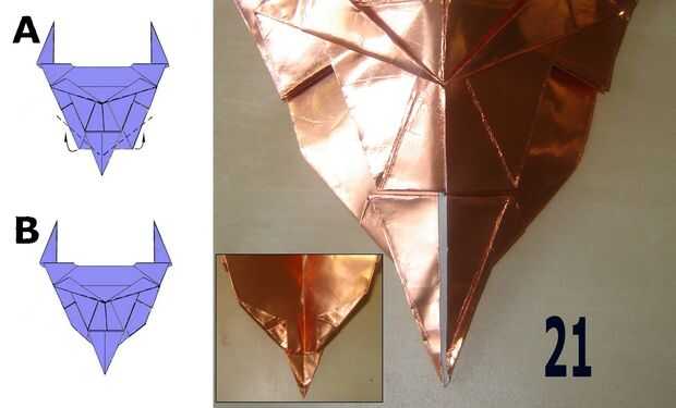 21 doble la parte inferior izquierda y derecha esquinas detrás formando una cara redonda.
