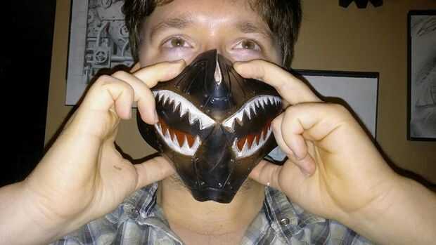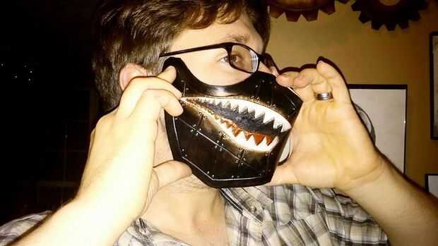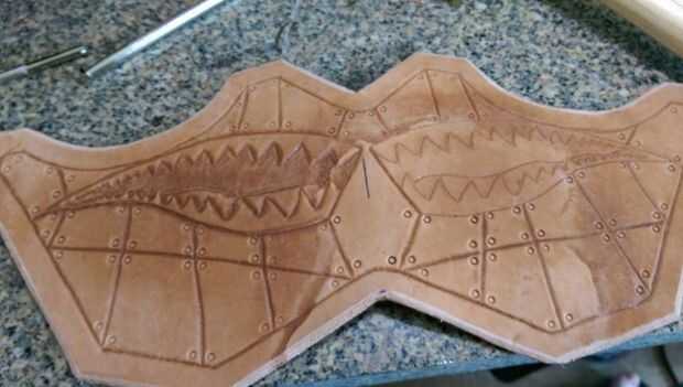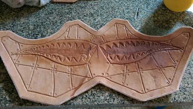 Para la parte de herramientas, yo busqué en Google tatuajes de dientes de bombardero y tamaño en photoshop para que quepa en cualquier lado de la máscara, y luego imprime. Luego recorto, dio a mi piel una humectación superficial y había grabado los recortes de los dientes al cuero en blanco con cinta de pintor. Después me fui sobre el contorno usando una aguja directamente en la impresión de la etiqueta. Después de eso, usé mi cuchillo giratorio a lo largo de todas las líneas y luego gratis entregó una cuadrícula como la placa de metal.