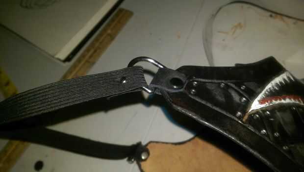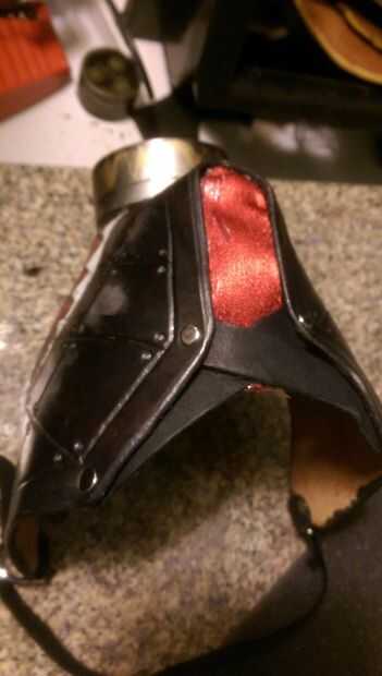 Ahora es el momento para fijar la correa. Usé una simple cinta elástica para mayor comodidad, pero usted puede hacer hasta una correa de cuero si te sientes muy fogosa. Cortar unos pedazos de cuero como el de la primera foto, luego tomar sus anillas y lazo los recortes sobre ellos en los principales puntos de los lados de la máscara. Perfore agujeros allí. Establecer dos anillos en d con remaches para sujetar la máscara. Ahora un poco de elástico alrededor de un anillo en d del lazo y fije por cualquier método, que sabe usted. Por ejemplo, usé un remache mini tapa doble porque soy terrible en la costura. Poner la máscara en su cara y lazo de la correa diagonal hasta sobre la parte posterior de la cabeza, sacar la parafina y cortar. Luego fíjela a la anilla. Su correa es completa.
