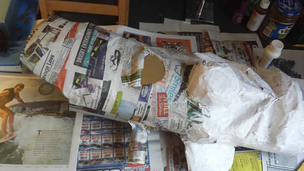 El siguiente paso fue cubrir el desorden todo en papel maché. Rasgaron el periódico en tiras largas. Yo probablemente podría han hecho cosas más suave había yo más pequeños trozos de periódico, pero no sé.
