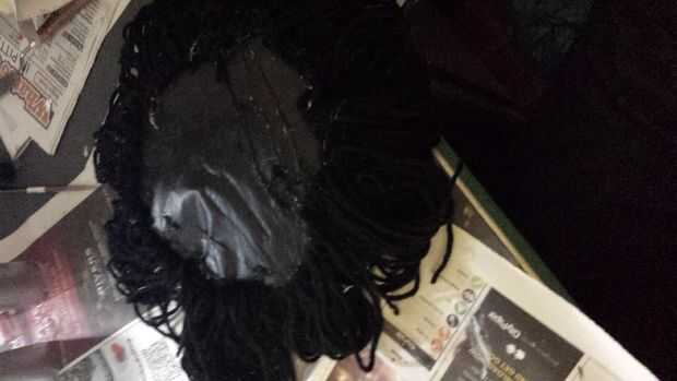 Tengo el tipo más barato y más grueso que pude encontrar. Yo sabía que tomaría para siempre para conectar cada "pelo" individualmente, así que necesitaba una manera de hacerlo a granel. Básicamente, enrollé un hilo alrededor de mi mano varias veces, creando un montón de bucles sueltos, luego pegado en caliente uno de los extremos de las asas a la pieza del cráneo. Trabajé en secciones, recorrer el exterior primero, luego subiendo hacia la parte superior; tres círculos concéntricos en todos. Entonces tomé un par de tijeras y había cortado los extremos inferiores de los lazos, los que no estaban pegados abajo.