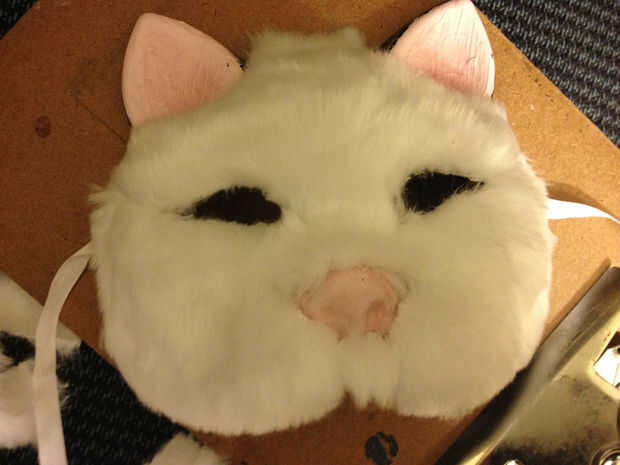 Presenta restos de piel sintética - buena-hacia abajo - sobre la máscara y trazado de las secciones que necesitaba. Después recorto, aplica pegamento caliente a la máscara y agrega la piel.
