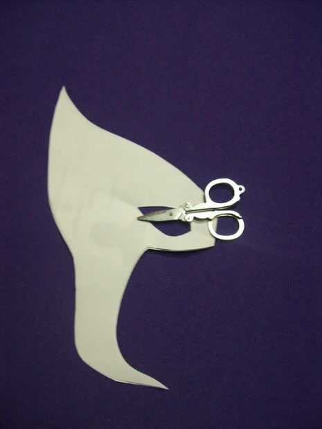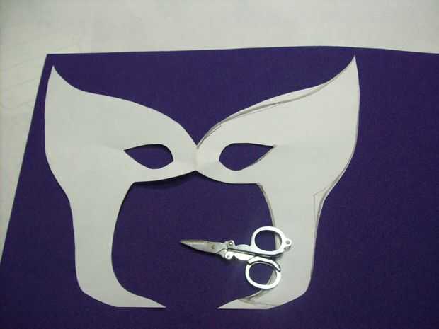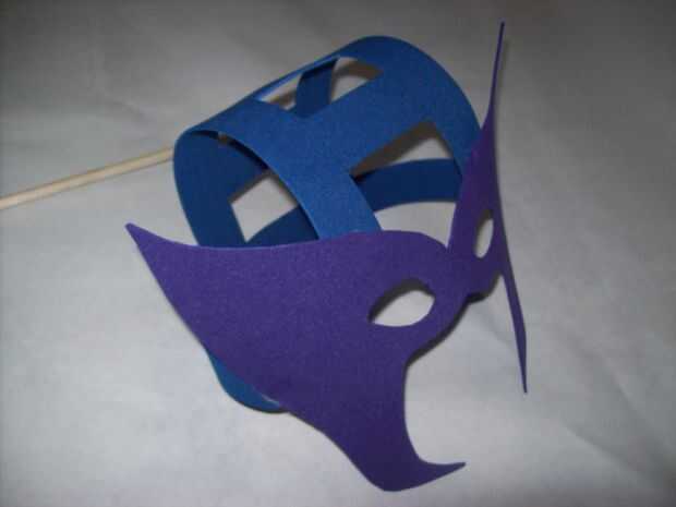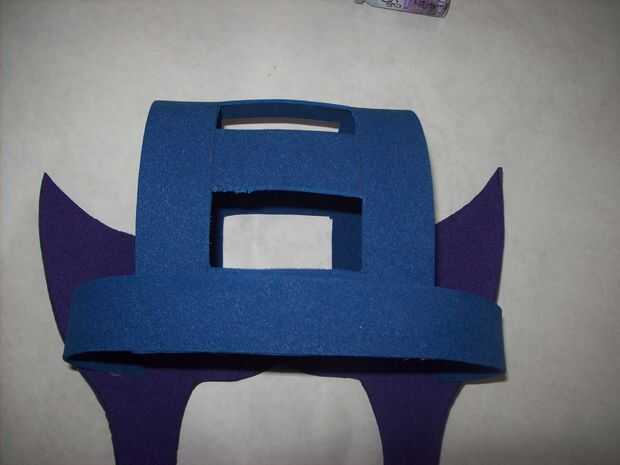 Dibujar en la hoja de papel el dibujo de la mitad de la máscara. Cut.Draw el diseño dio como resultado en la púrpura Foamy.and cortarlo hacia fuera. Lo mismo con la cabeza pedazo de Blue.Glue lo. Espero que les guste tasa y voto.