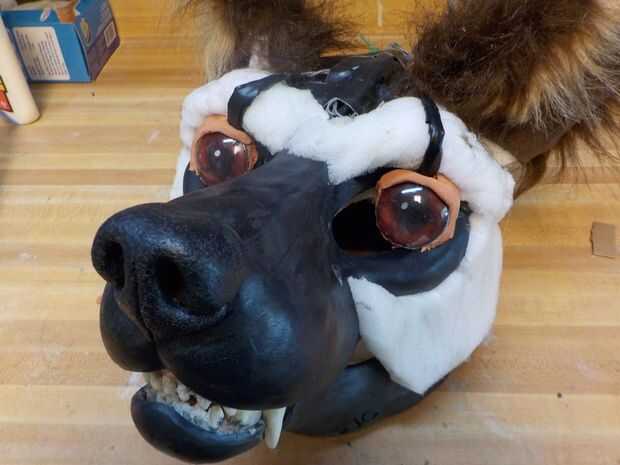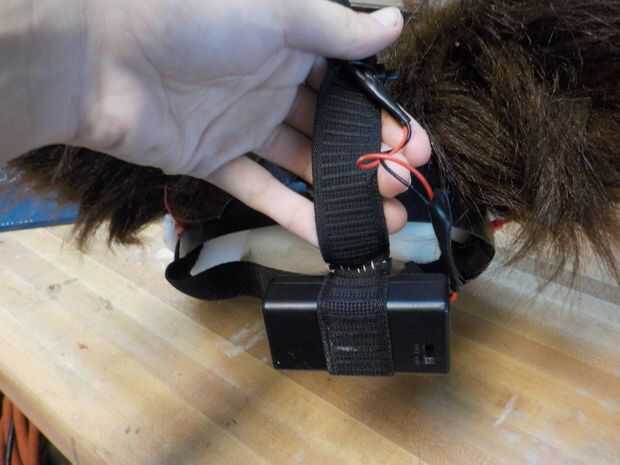Este paso se podría haber hecho antes, excepto los ojos eléctrico había sido enviados desde Canadá y tomó un tiempo para llegar. Cuando llegaron aquí, temporalmente había quitado la piel de la cara y sujeta los ojos en su lugar con pegamento y la arcilla ligera de Crayola modelo Magic. Aseguró el cableado en la parte superior la cabeza con cinta adhesiva, y el paquete de baterías se resbaló en la venda de elástico en la espalda.