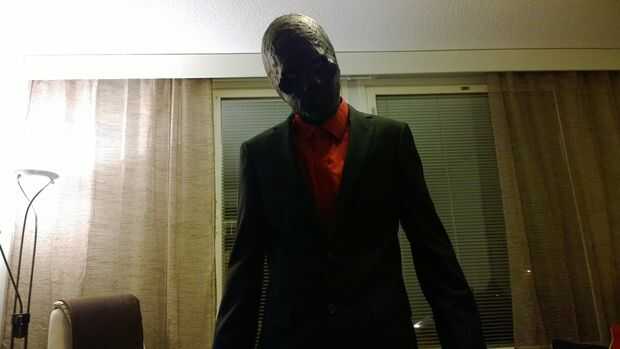 Agarrar un traje blanco con camisa negra si tienes, yo no llevo un traje negro con una camisa roja. También puse un pasamontañas fino bajo la máscara para cubrir mi cuello y el pelo.