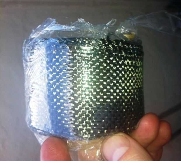 Cinta de fibra de carbono de 1" o 2" x 1 metro - $5 - http://www.carbonfiber.com.au/ o http://www.cstsales.com/products.html. Es más barato conseguir la cinta de una metro/yarda de tela y es más fácil trabajar con esta aplicación. Es mejor comprar uno con un borde de orillo el carbón sólo se deteriora en una dimensión.