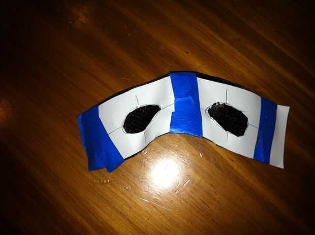La plantilla del paso anterior a la máscara de carbono en blanco de la cinta. Utilizar la Dremel para cortar los orificios de ojos y lisa hacia arriba.